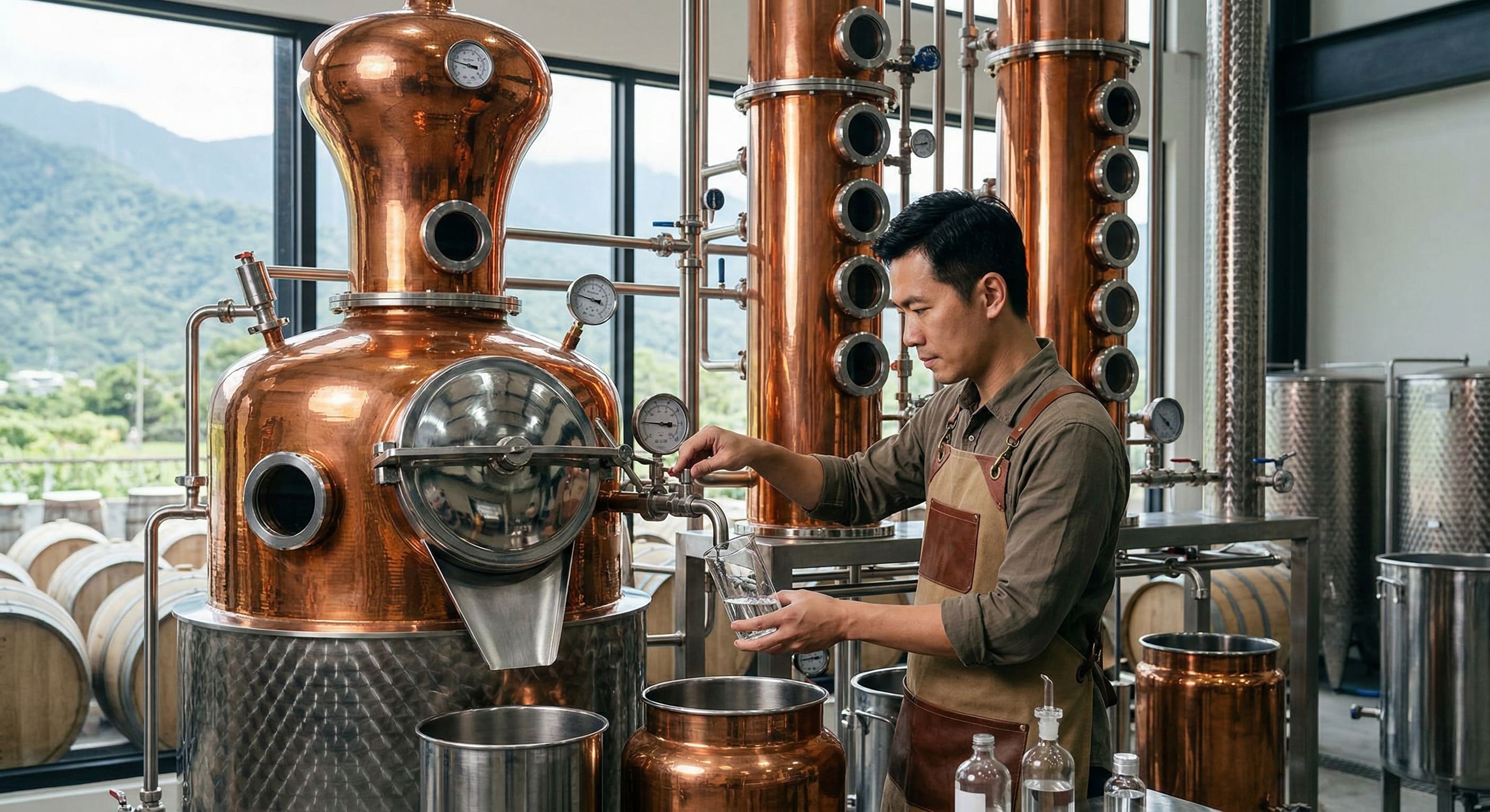在專業烈酒領域,設備的精密度與材質,往往決定了酒體最終的純淨度與層次感。綠點酒莊作為一座隱身於花東縱谷的琴酒酒莊玉里秘境,深知要打造出能征服國際挑剔味蕾的作品,絕不能妥協於任何硬體設備的選擇。為此,我們斥資引進了德國頂級的銅製蒸餾器,這套設備不僅配備了極度精密的溫控系統,更擁有特殊設計的多層回流塔。